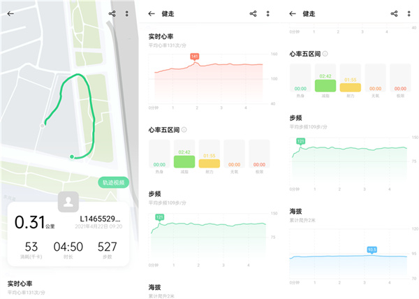 在APP中,运动路径、心率变化、步频等数据都会用更为直观的图表来呈现。一加Watch的配套APP甚至还提供了一个轨迹视频功能,可以再现整个运动过程。