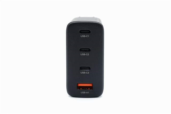 充电器侧边配置3C1A四个USB接口,接口下方均有字样标识;USB-A母口胶芯为橙色设计,C口胶芯均为黑色。