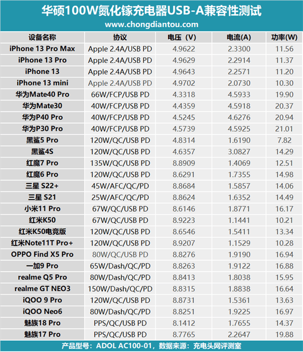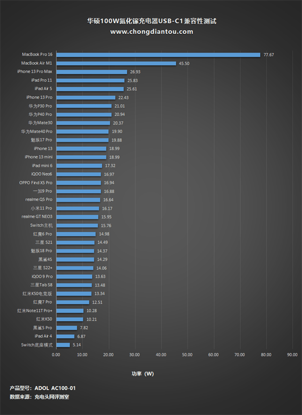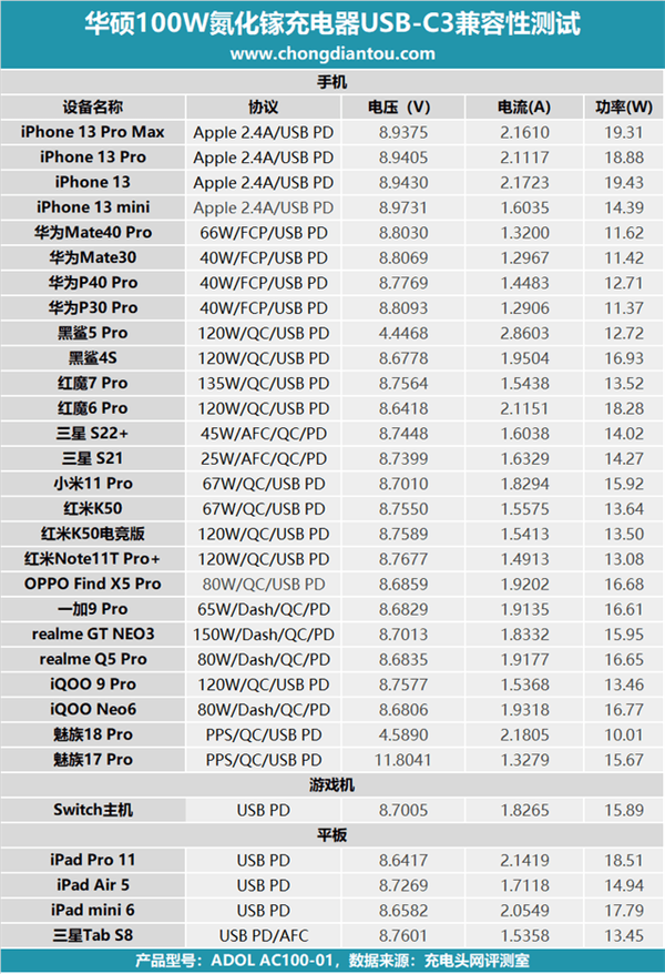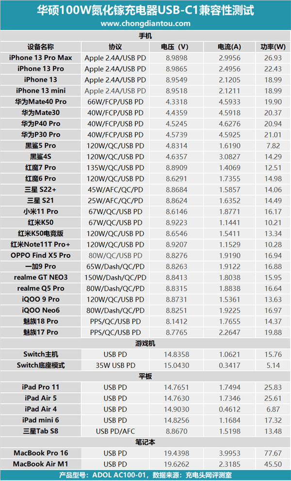将USB-C1接口的兼容性测试属于汇总,整体来看USB-C可以为手机、游戏机、平板电脑以及笔记本电脑提供快充需求,100W的输出功率也可以满足大部分笔记本电脑的快充需求。