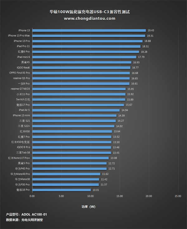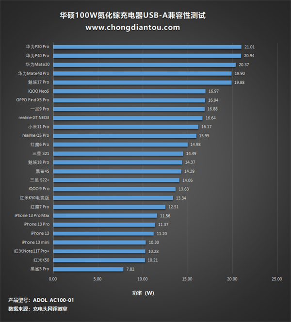 兼容性测试环节可以清楚的得知充电器为各个设备的充电情况,充电头网会使用数十款设备搭配充电器进行测试,为读者呈现真实的测试数据。因为USB-C1和C2有着相同的性能表现,所以此次兼容性测试部分仅测试USB-C1.