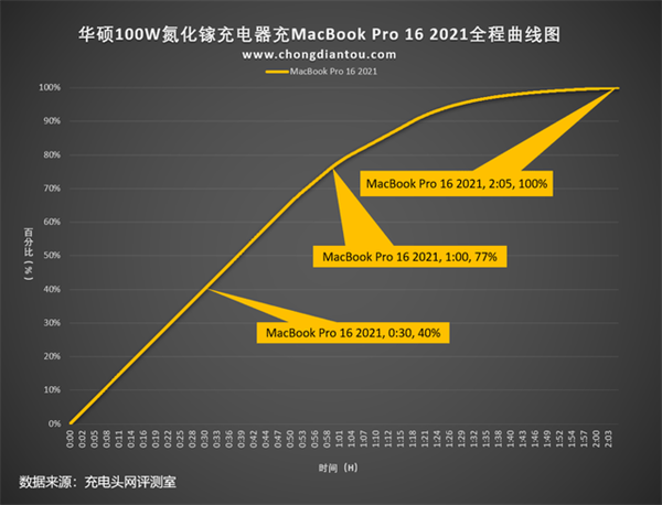 将数据绘制成曲线图,可以看出,充电器为MacBook Pro 16 2026半小时充电40%,1小时充电77%,完全充满耗时约2小时5分。