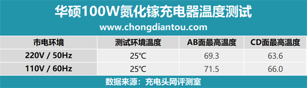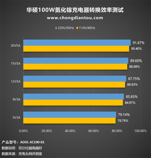 充电器本质上是一种转换设备,过程中会有损耗,以热量的形式散发出来。我们平时看充电器上面的参数输出100W或者65W是充电器可以为设备提供的最大输出功率,但充电器从插座上汲取的功率往往要更大一些,下面是充电器在220V 50Hz和110V 60Hz交流输入的情况下分别进行了转换效率测试,测试结果如下。