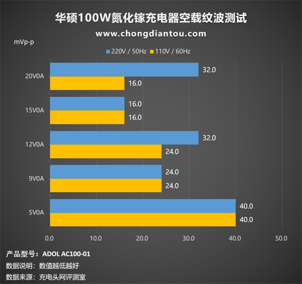 纹波测试分为空载(柱状图中Y轴电流为0A)和重载(柱状图中Y轴电流为非0A)两种。空载部分,充电器在220V 50Hz交流输入下,处于5V0A空载状态时纹波最高,为40mVp-p;处于15V0A空载状态时纹波最低,为16mVp-p。