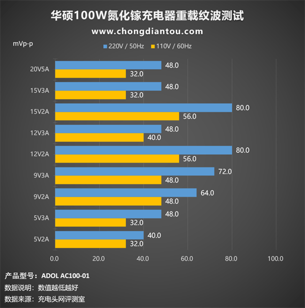 纹波数值越低,说明充电器的输出质量越高。从测试得到的数据来看,整个充电器的纹波数值都处于较低的水平,说明充电器的输出质量是非常高的。