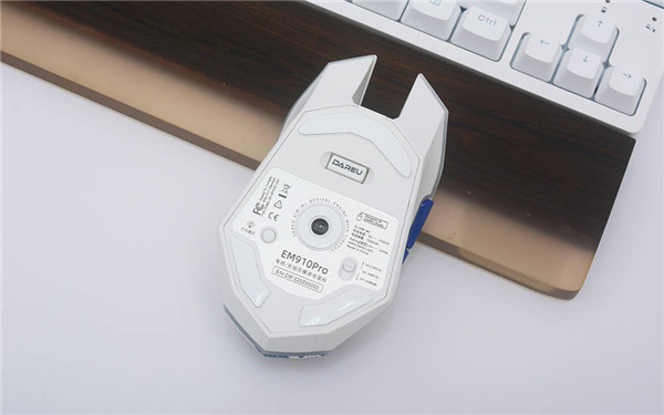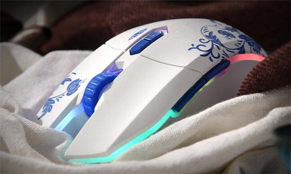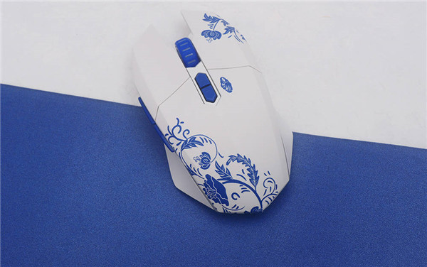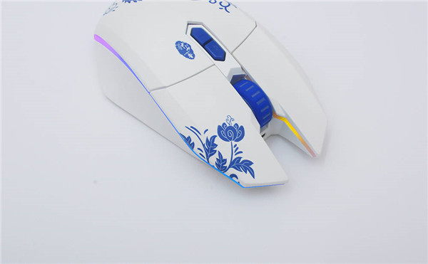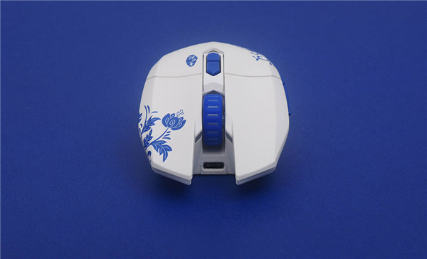EM910 Pro釉下青鼠标的外观延续达尔优经典牧马人外形设计。上盖的“青花”图案则出自达尔优设计团队的纯手绘设计。洁白的机身与青色花枝图案交织,让人所感便如青花瓷瓷器一般的幽雅清丽。。这款鼠标的尺寸与EM910完全一样,约为128mm×71mm×42mm,而与最早的牧马人系列鼠标相比,尺寸上要略小了一些。