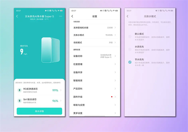 从APP来看,我刚刚产生了0.58升的纯水,总共消耗自来水0.86升。当然,我们也可以根据实际的使用情况设置节水模式,从而提升净水的产出率。