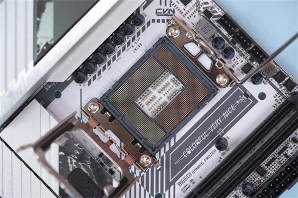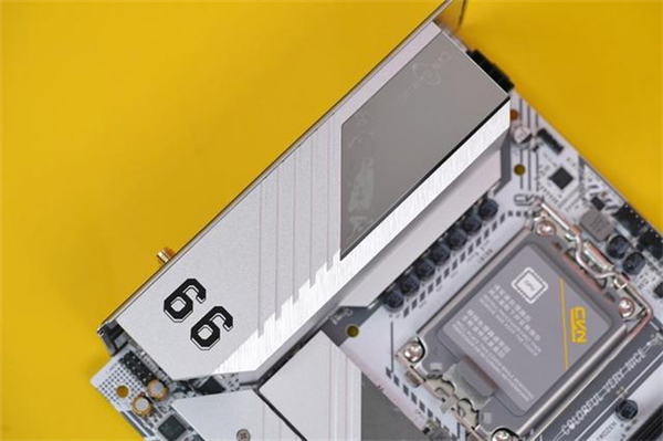 我们可以看到,B660I GAMING FROZEN的寒霜散热系统几乎覆盖了CPU左边全部的区域,不仅提升了颜值,散热效果也增强了不少。