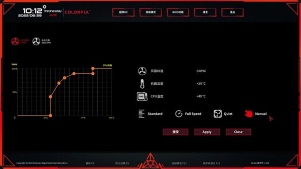 风扇设置界面可以自由的调整温度曲线,比如你可以设置在40度以下CPU风扇与机箱风扇停转,实现低负载下0噪音。