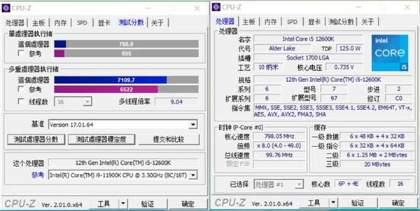 首先是CPU-Z,i5-12600K测得单核分数787,多核分数7109。