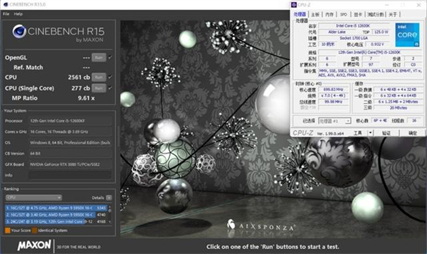 接着是CineBench R15,i5-12600K的单核分数277cb,多核分数2561cb,其中单核成绩与顶级的Z690主板只差了1分,多核分数少了20cb左右,差距不到1%。