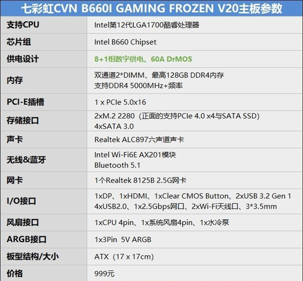 七彩虹CVN B660I GAMING FROZEN V20主板详细参数如下: