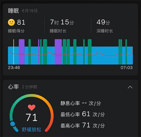 为了更完整的展现手表的睡眠监测功能,我勉为其难戴着手表睡了一个晚上。发现记录相当详细,同时自己的睡眠好像比较一般嘛,深睡时间并不长。不过最低的心率和我用Apple Watch测的有点出入,后者最低达到50左右。当然Apple Watch的心电图功能看着还是相当专业的,虽然没有啥用。