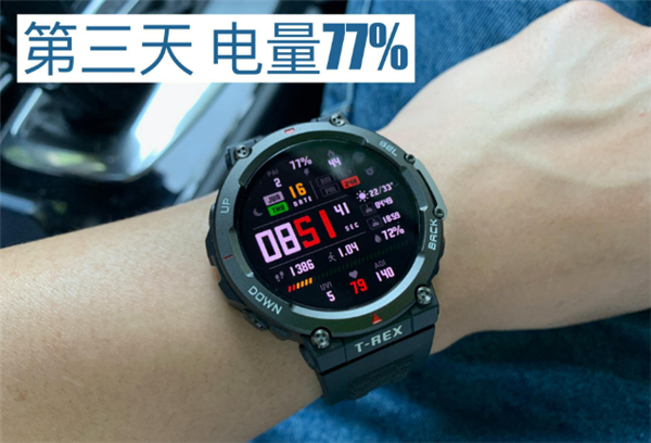 猜猜我正常使用三天用了多少电量?才百分之十几!第一天是84%,第三天是77%。我的正常使用,是指早上6:00多上班,戴上到了晚上睡觉前摘下,中间是正常使用频率,比如看时间、信息提醒、运动等等。每隔一天我看到电量,只掉了几点?!我甚至觉得有些不可思议,一度怀疑是不是手表系统做了手脚,把正常的耗电量隐瞒掉了,有点像电动汽车的电池续航一样。
