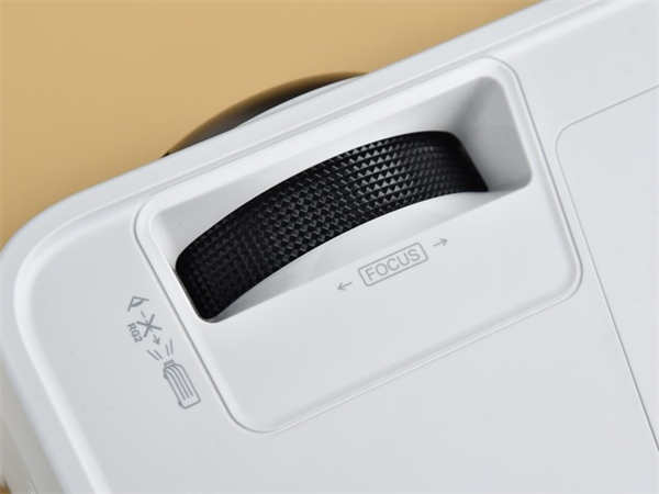 在镜头的上部则是调焦环,可以调节清晰度,而调焦环的旁边就是机身按键:比如常见的菜单按键以及方向按键(方向按键同时兼具梯形校正效果)、信号源选择按键等等。