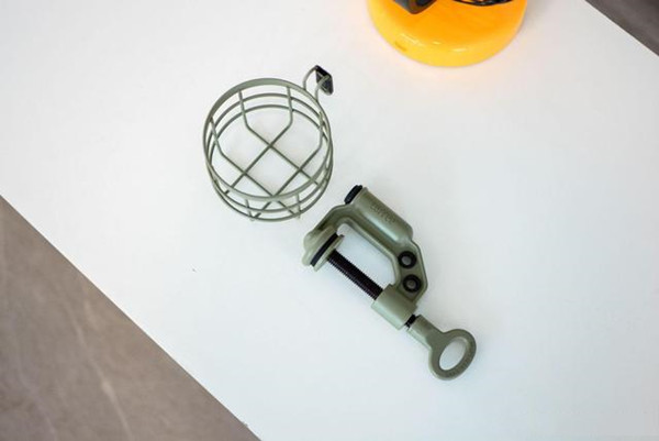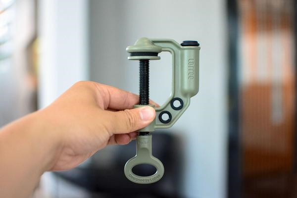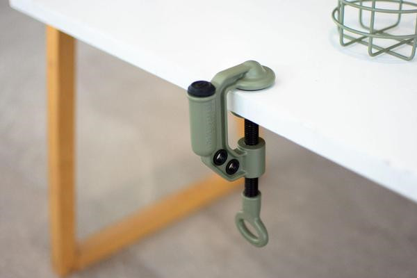 沉甸甸的G字架,可以轻松的固定在桌面上,牢固的夹住桌面。表面采用了环保漆,绿色也非常养眼。