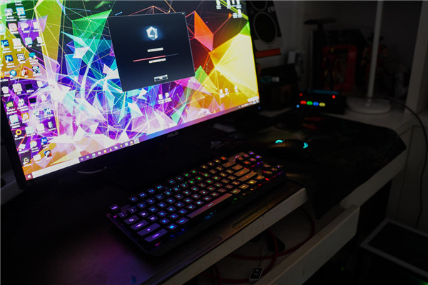 通上电看看灯光效果,默认就是跑马灯模式!亮度可调,但是视觉效果上没有冰豹、雷蛇那种浮夸到亮瞎双眼的程度,这方面ROG 游侠RX TKL还是有所克制的。不过对于我来说只要有光就行,黑暗环境下可以看到字符就够了。再说了,买了无线键盘当然要用无线模式啊!这时候能发光键盘对于功耗续航就提出了功耗要求,所以,各花入各眼吧。