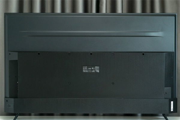 来到机身背面区域,可见有相当大一部分空间被分配给机身内元器件,散热口区域也很大,这与雷鸟一贯的设计思路相同。上部不同于R645C的亮面材质外壳,而是采用了哑光塑料外壳,中间设计有一条突起的加强筋。背面中部有这款产品的信息标签,其中标明55英寸版本的额定功耗为230W,通过了DTS、杜比视界和杜比全景声认证。