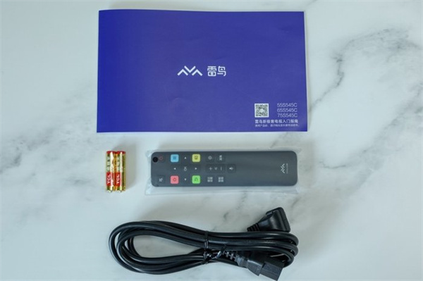电视包装中的配件也很简单,除已经安装的支架和螺丝外,还有一本入门指南,雷鸟新一代遥控器及电池,以及电源线。