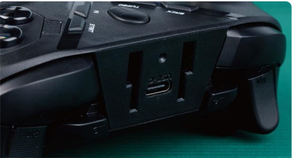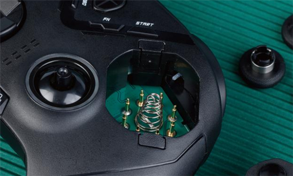 不仅如此,雷神魔蝎游戏手柄G70的包装中还提供了一个手机架、两颗摇杆以及一个可替换的ABXY键。雷神魔蝎游戏手柄G70的正上方不仅提供了一个USB-C充电接口,同时还提供了手机支架槽,也就是说玩家可以利用它来夹住手机,从而更好地把玩手游;而摇杆及ABXY键均支持模块化设计,原装为机械微动按键,随机附带一个可亮灯的导胶按键模组,满足各类玩家对不同手感的需求。