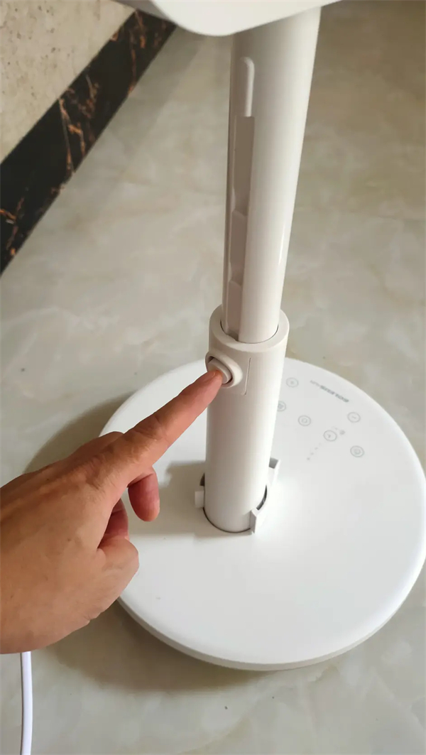 按下这个按钮就可以调节舒乐氏空气循环扇的身高了,柱子底下那个环是遥控器存放支座,可以取下的,本来没有安装。是我刚扣下去的。上面有个凹槽可以安放遥控器,这遥控器使用时必须正对着空气循环扇的正面,最远距离是5米。这款空气循环扇操控是可以用遥控器,也可以用底座上面的控制面板操控的,底座上的是触摸面板。