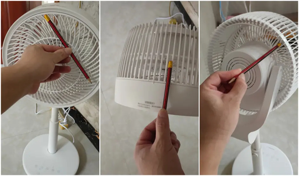 我们都知道电风扇的扇页在电机的驱动下高速旋转,特别是像舒乐氏空气循环扇使用的是功率强劲的直流无刷电机,使风速可以达到 5.5m/s ,这么高的转速而且又是需要在儿童空调房使用的环境下,风扇对儿童的防护功能就很重要了,拿到风扇之后,我马上对空气循环扇的外扇页格栅缝隙做了测量,发现缝隙间是连一支铅笔都放不进去,如此小的缝隙手指误触之下是不容易塞进去被扇页打到的。
