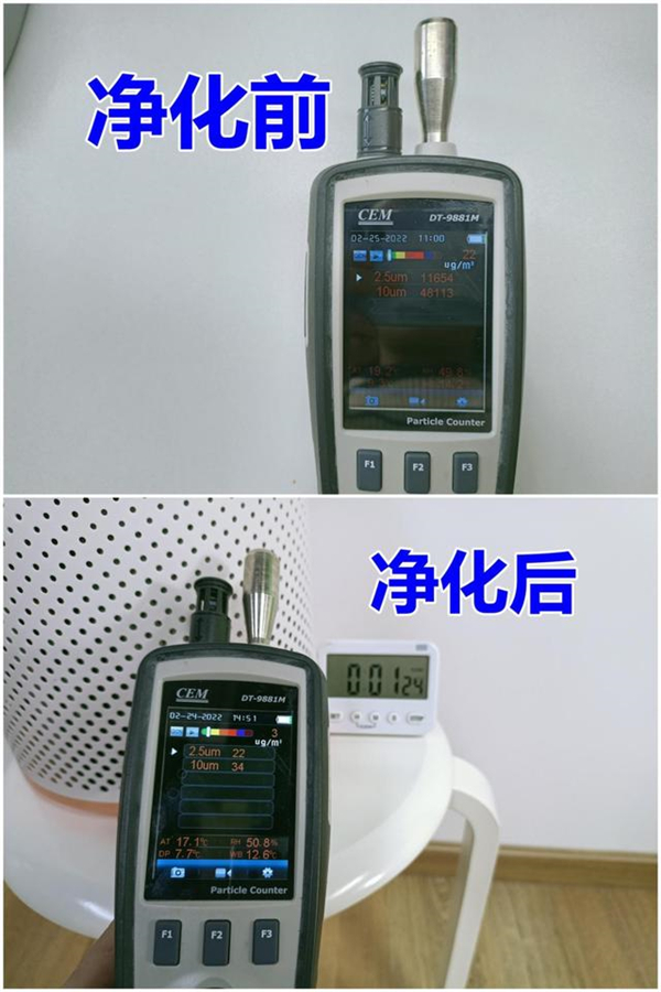 新颐小白微微儿童版空气净化器净化1分钟24秒后,PM2.5仅剩下22ug/m,PM10也仅仅剩下34ug/m,空气变得非常清新了,空气中二手烟消失不见了。