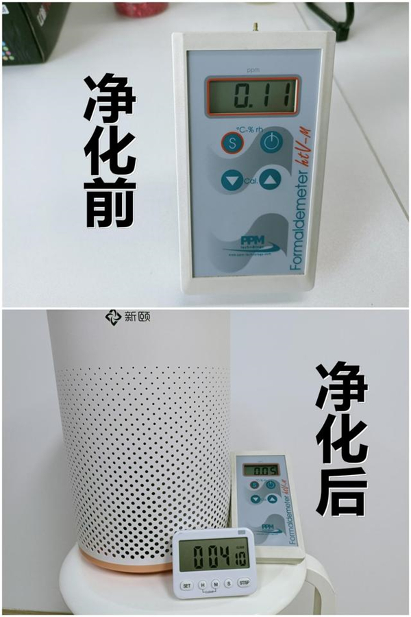 新颐小白微微儿童版空气净化器净化4分10秒后,甲醛便降低到了0.05PPM,实际甲醛浓度也仅剩0.067mg/m,净化后的室内甲醛远比国家规定的室内安全甲醛浓度低得多。