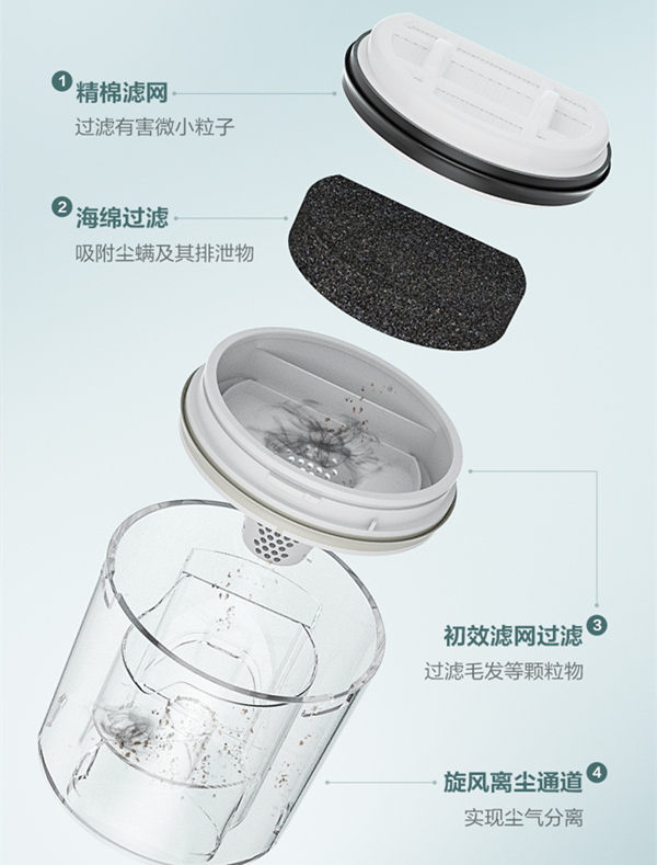 好的清洁方式是为家的干净做减法,特别注意在清洁的同时对环境不造成二次污染。为此特别给BISSELL必胜无线除螨仪G1设置了四重严密过滤层,牢牢锁住尘螨与过敏原,让干净更安心。第一重旋风离尘风道实现尘气分离,再由初效滤网完成毛发等大颗粒物过滤,海绵层进一步吸附螨虫及其排泄物,精棉滤网则负责滤除微小粒子,层层精细过滤让尘螨只出不进。