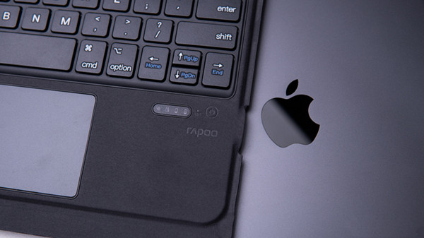 键盘采用双面对折设计,通过磁吸结构吸附固定,磁吸松紧度适中,日常抖动不会让卡扣松开,皮质面料的“rapoo” logo处可作为ipad保护套的合页,也可做ipad键盘支架的支撑连接。