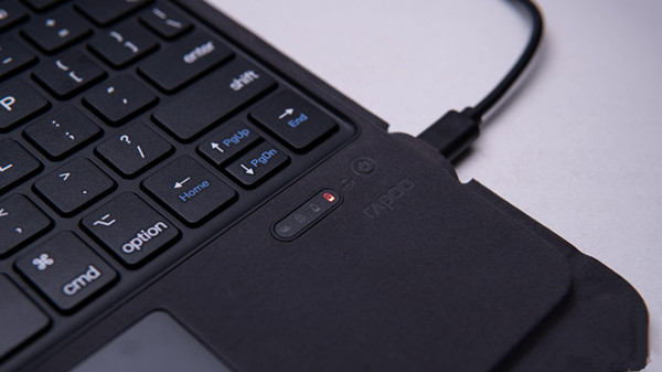 触控板右侧为开关/复位按键和状态指示灯,指示灯可以直观看到剩余电量、蓝牙连接、键盘大小写等状态。