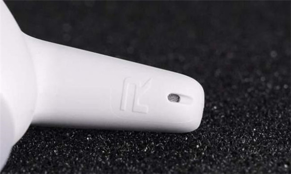 耳机侧面可以看到耳机根据人体工程学进行的造型设计,有助于佩戴更加贴合。耳机柄底部设计了耳机的主麦克风开孔,用于耳机的通话/语音拾音,开孔处还设有细密的金属网防止异物进入耳机内部。在主麦克风开孔上方还有L/R的标识,方便用户区分左右耳。耳机头主出音导管圆孔设计,在出音导管处设有细密的防尘网防止异物进入耳机音腔内部。出音导管旁边的圆形开孔为耳机的泄压孔,用于平衡耳机的内外气压,提高耳机的声学性能。