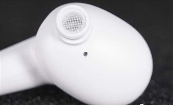 在耳机出音导管侧面采用蘑菇设计,用于协助固定耳帽。耳机头顶部设有通话降噪麦克风开孔,用于实现耳机的通话降噪功能。通话降噪麦克风开孔近距离特写,内部设有细密的金属防尘网防止异物进入耳机音腔内部。