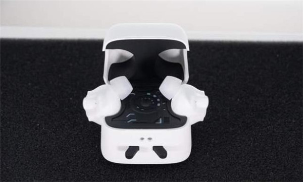 打开充电盒,将耳机安装到充电盒内部,耳机与在充电座舱水平面约30°角放置,呈现出小耳朵的形状。耳机充电座舱采用了机甲风设计,设置多个呼吸灯开窗,指示设备的工作状态。安装耳机后充电盒侧面一览,耳机完美的变身成了小电视的天线。
