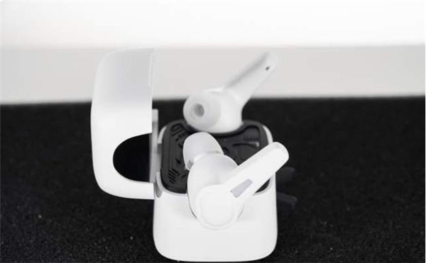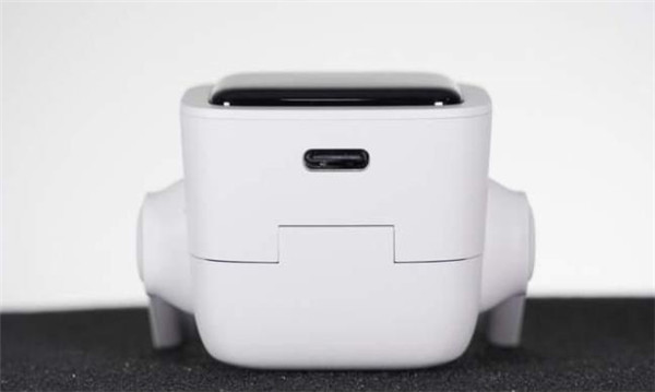 为耳机充电的金属触点以内凹设计,防止汗液侵蚀。充电盒为装载耳机状态整体造型就像一个小电视一样,正中间的黑色屏幕使用亮面塑料辅以曲边设计营造类似于卡通电视的反光效果。