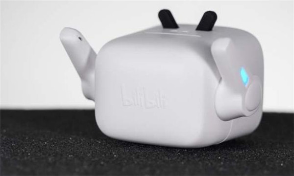 将充电盒闭合,充电盒正面一览,正面的小屏幕内置了呼吸灯,操作充电盒时呼吸灯会指示充电盒的工作状态,二次元旗下满满。充电盒的外壳材质有种橡胶质感,有助于营造卡通造型,充电盒背面印有bilibili的品牌信息。