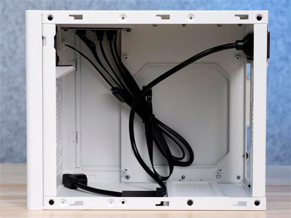 接下来,拆开机箱左右机箱盖,瞧一瞧这款ITX机箱的内部空间布局。一看看上去,银欣SG16的内部空间设计得很简单。线缆提供了机箱控制区域连接线,以及一条电源延长线。ITX电脑主机,玩得就是小而精,需要特别注意机箱能够兼容的各种尺寸设备。