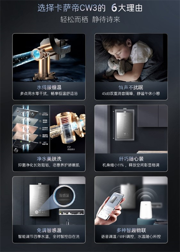 卡萨帝这款热水器搭载了水量伺服器,可以将水温温差精准控制在±0.1°之内,另外还采用了旁通混水技术,就算在使用过程中关水再开,也能将温差控制在±3°左右,避免着凉。同时这款热水器采用智能四分段燃烧技术,通过智能检测用水量大小,调节火排燃烧数量合理控制水温,实现多点用水水温互不干扰。了另外这款热水器采用创新磁净抑垢科技、遇水缓释抑垢因子,有效阻隔水垢滋生,保证水质洁净。