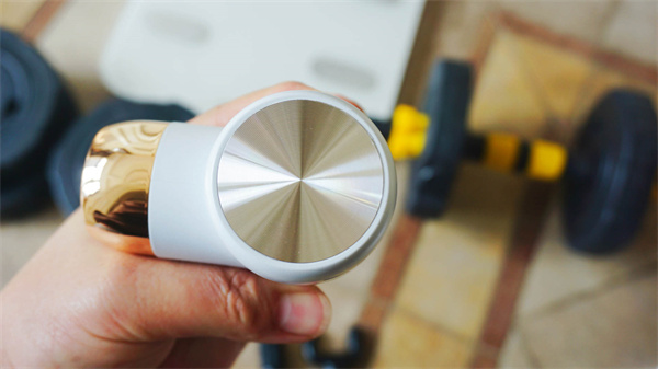 筋膜枪顶部是金属螺纹拉丝,不仅增加了产品的美观,而且应该也具备散热功能。