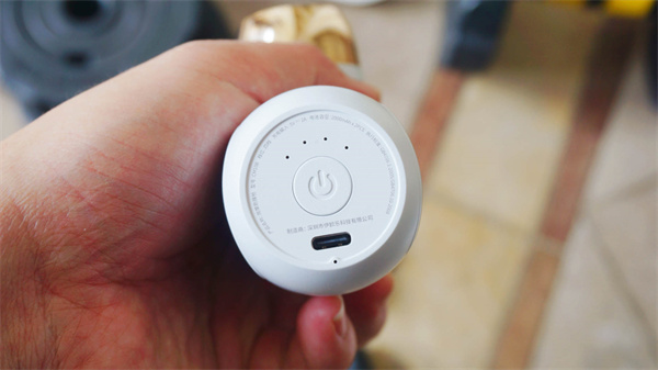 底部中间是电源开关,长按2秒开关机,开机状态下短按切换档位,机身档位目前是分四档,上面会有工作指示灯显示。另外,该款筋膜枪采用的Type-C充电口,这个设计我比较喜欢,毕竟现在大部分数码设备都是采用Type-C充电线,以后出门只要带一条线就足够了。机子内置了2节2000mA锂电池,官方数据续航约500分钟。