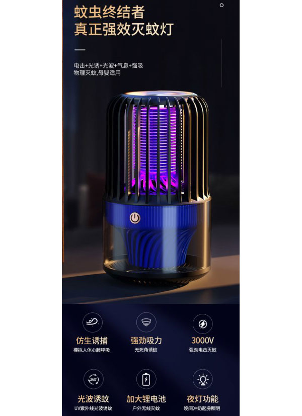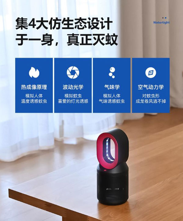 小米有品灭蚊灯集4大仿生态设计于一身,真正灭蚊,仿生态热成像原理,模拟人体体温,吸引蚊虫,利用波动光学,模拟蚊虫喜爱的光波,诱导蚊虫过来,根据空气动力学配备5叶强劲风扇,对蚊虫形成巨大龙卷风,周边蚊虫会被牢牢吸附到机内无法逃脱。