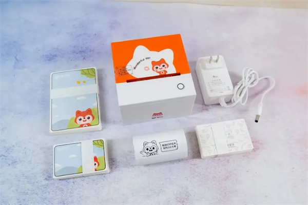 打开包装盒,里面有趣学伴伴读打印机TP2.一卷带背胶的热敏打印标签,3叠卡片,以及一个电源适配器。