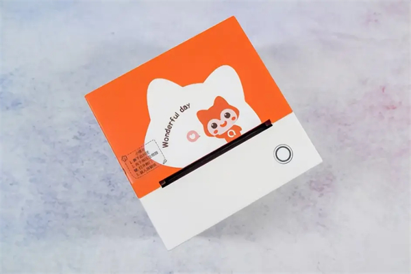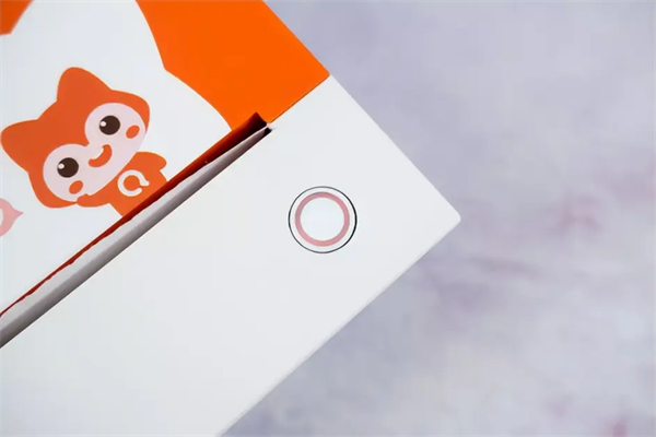 趣学伴伴读打印机TP2的外形设计有点方,正面印有可爱的卡通图像,右下方设计有机身唯一的开关按键。在卡通图像和白色底部的交界处,是标签纸的出口。