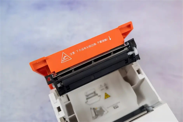 按下左侧的拨键,打开纸仓,就可以看到机身内部的情况,趣学伴伴读打印机TP2可以使用80*80mm的热敏标签纸,支持带背胶。趣学伴伴读打印机TP2采用进口ROHM打印头,可打印超过50公里,使用寿命更长
