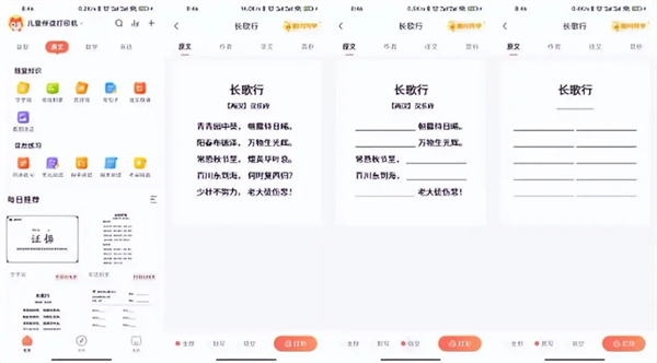语文方面可以学字词、词语积累、赏诗词、写句子、语文背诵、看图说话,还能进行同步练习,单元测试,期中测试,期末测试以及考点精炼。像赏诗词,可以打印原文,也可以设置成填空,还能变成默写,这样的功能也是非常实用。
