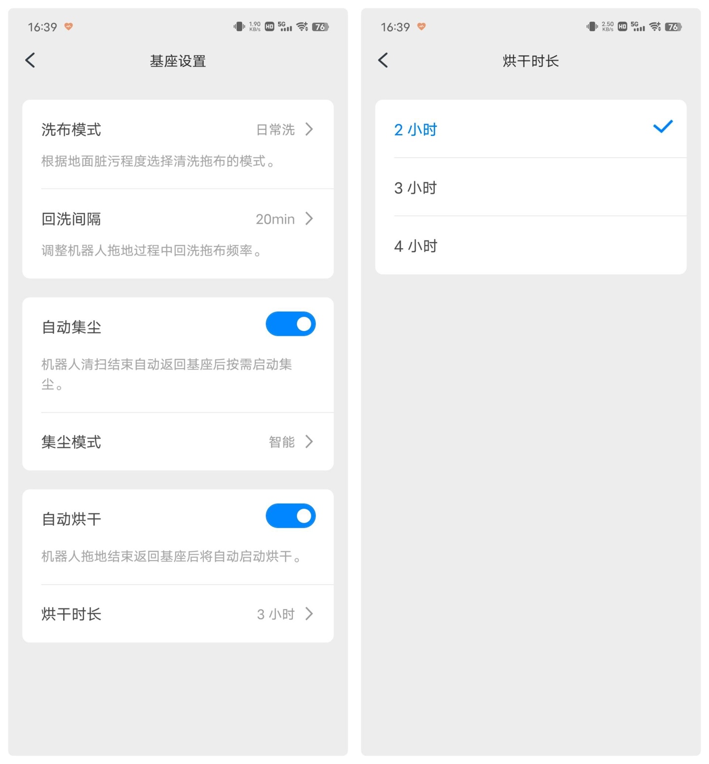 清洗拖布结束后,此时智能烘干套件会开启工作,这里选择烘干时长为 2 小时,在工作过程中,石头 G10S 的智能烘干套件工作声音非常小,远低于清洗拖布时产生的噪音,在略微嘈杂的办公室里,不靠近设备,基本听不到烘干时产生的噪音。