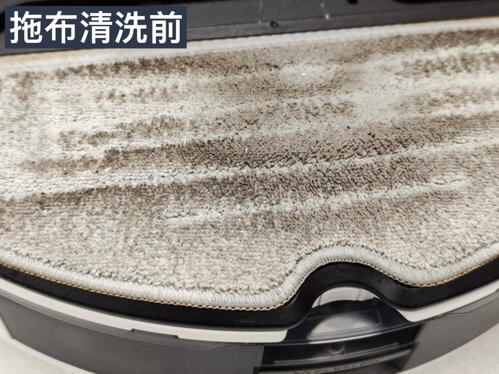 首先,让石头自清洁扫拖机器人 G10S 拖地工作 10 分钟左右,擦地强度选为“强力擦”。工作分钟后,此时拖布上已经集满了污垢。