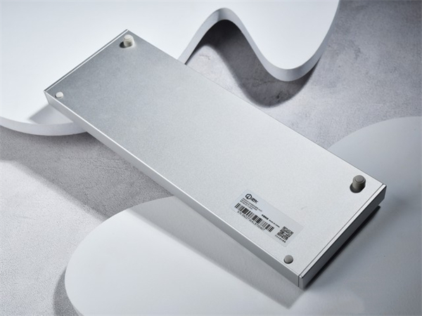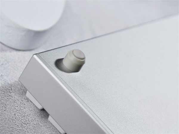 这款键盘商务铝制底座直上直下,底座边缘进行打磨,过渡自然不割手。配合底部两枚可拆卸的撑脚,为键盘打造出上高下低的倾斜角度。撑脚高度是固定的,也就是说这款键盘支持两档高度调节。键盘上下共设计有4枚圆形防滑脚垫,可以提供不错的抓地力。