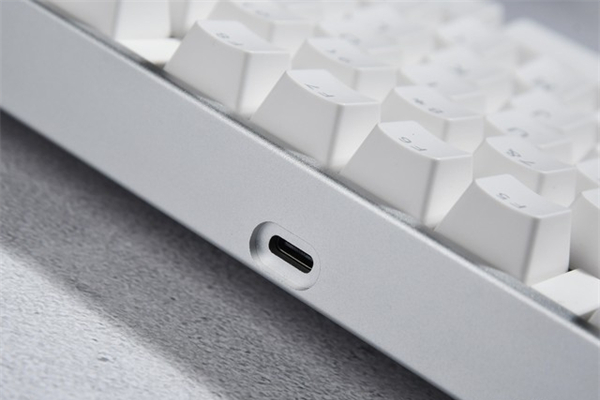 这款键盘键盘支持有线单模连接,在线材方面,它依旧保留了键线分离设计,键盘顶端中间位置配备了USBType-C接口。另外,接口周围也留有一定的空间,这样一来,如果原装线材损坏,手边任何一根USB-C线都可以用来给键盘传输信号,而不用担心线头插不牢固。