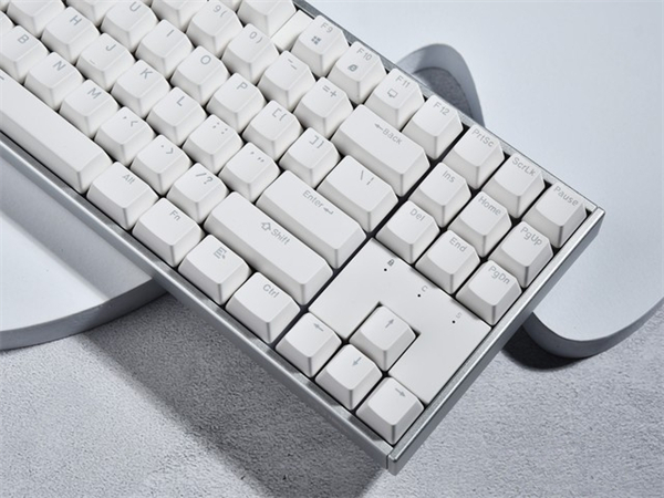 艾石头AL87铝合金机械键盘使用OEM高度的ABS键帽,双色注塑工艺,字符做到了闭口。它的内部设置加强筋,底部水口处理干净。白色键帽的耐污性一般,用久了沾染油污是不可避免的,定期清理必不可少,但与此同时更高的颜值也让不少人对白色外设更加青睐,所以相信对于买它的用户来说,这不应该是一个纠结的点,使用一段时间注意清洁即可。