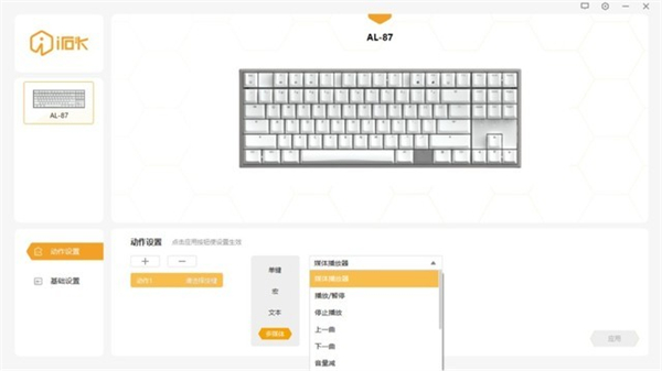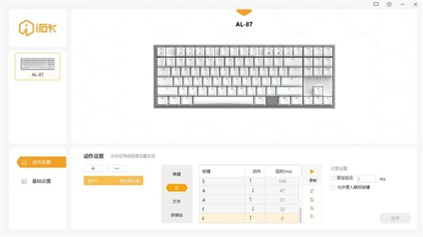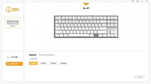 艾石头AL87铝合金机械键盘可通过Fn+Esc启动驱动程序。这款键盘的驱动在官网上可以下载,它的界面简洁,左侧为设置选项,可以选择定制键盘按键编程和回报率,右侧则是键盘的效果俯视图。